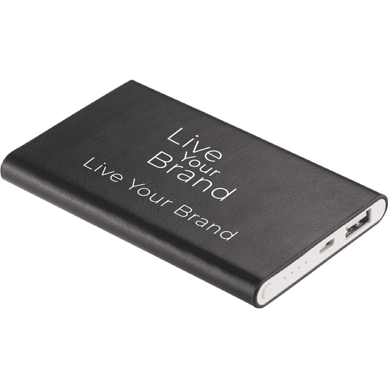 The UL Listed Abruzzo 4,000 mAh Power Bank contains a Lithium Polymer Grade A battery (14.4Wh) and includes a leatherette cover.